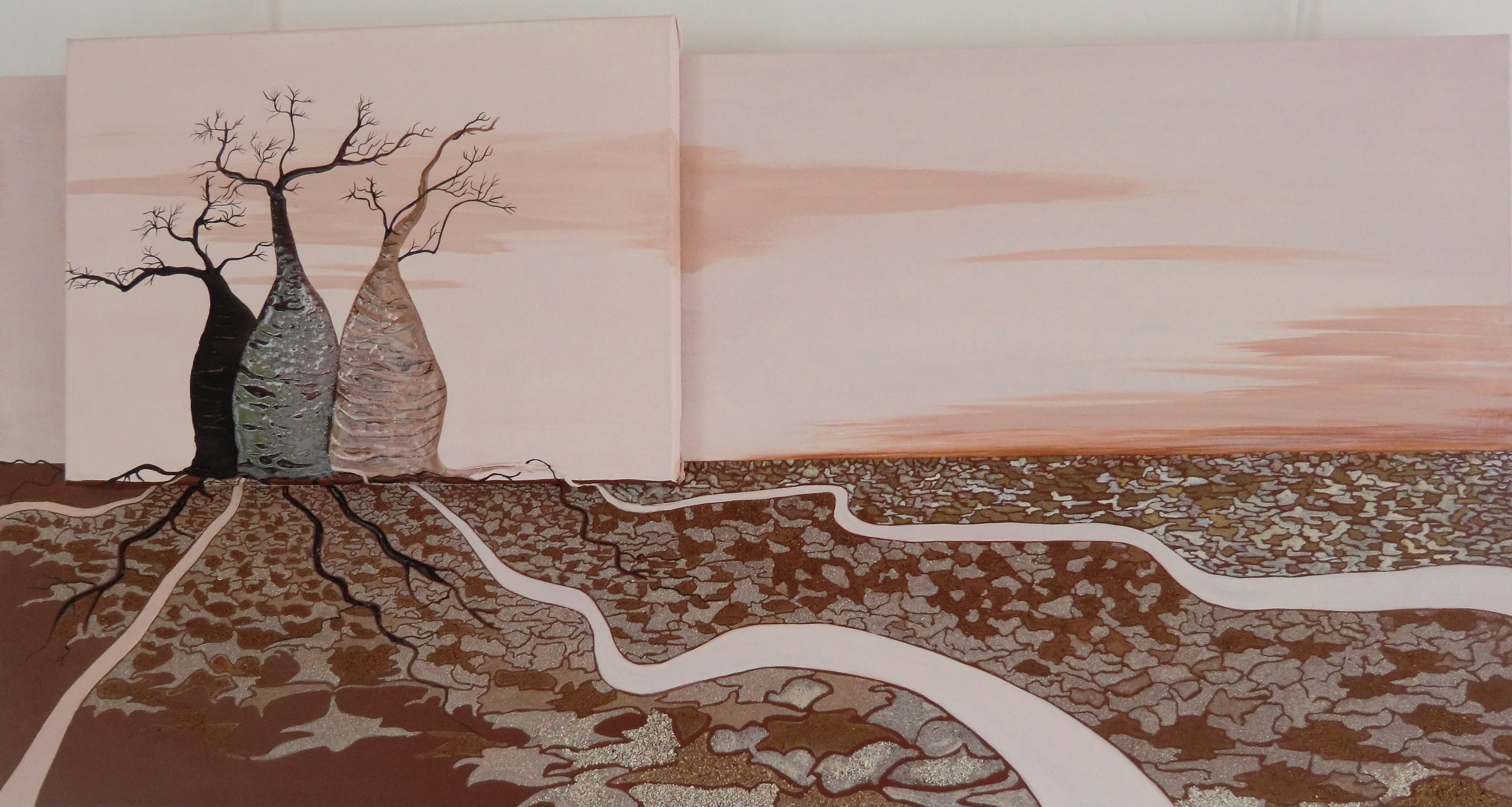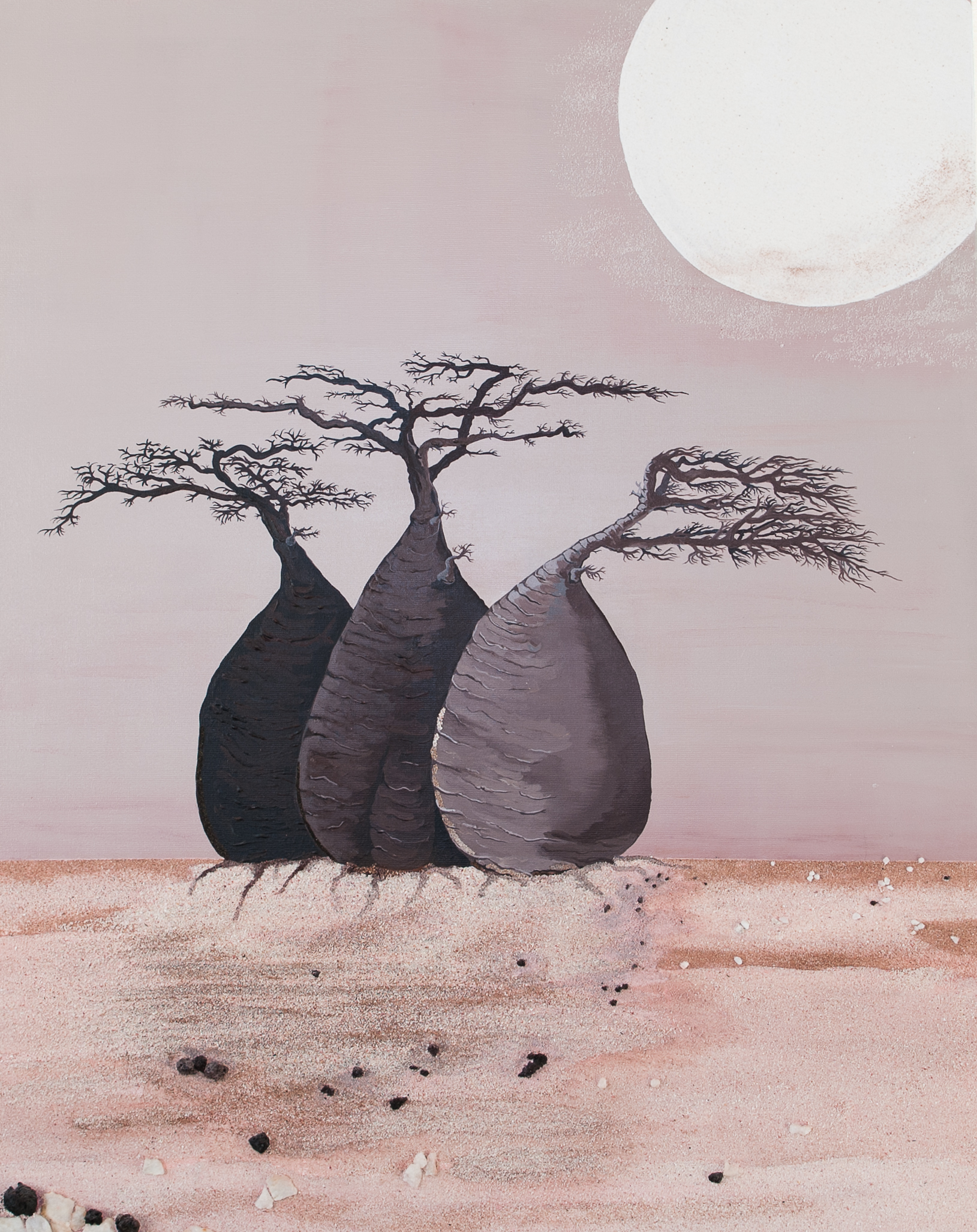 – DISPONIBLE – « Baobabs, trois amis » – 80 x 100 -Acrylique sur toile et sables du monde et lapillis volcaniques –