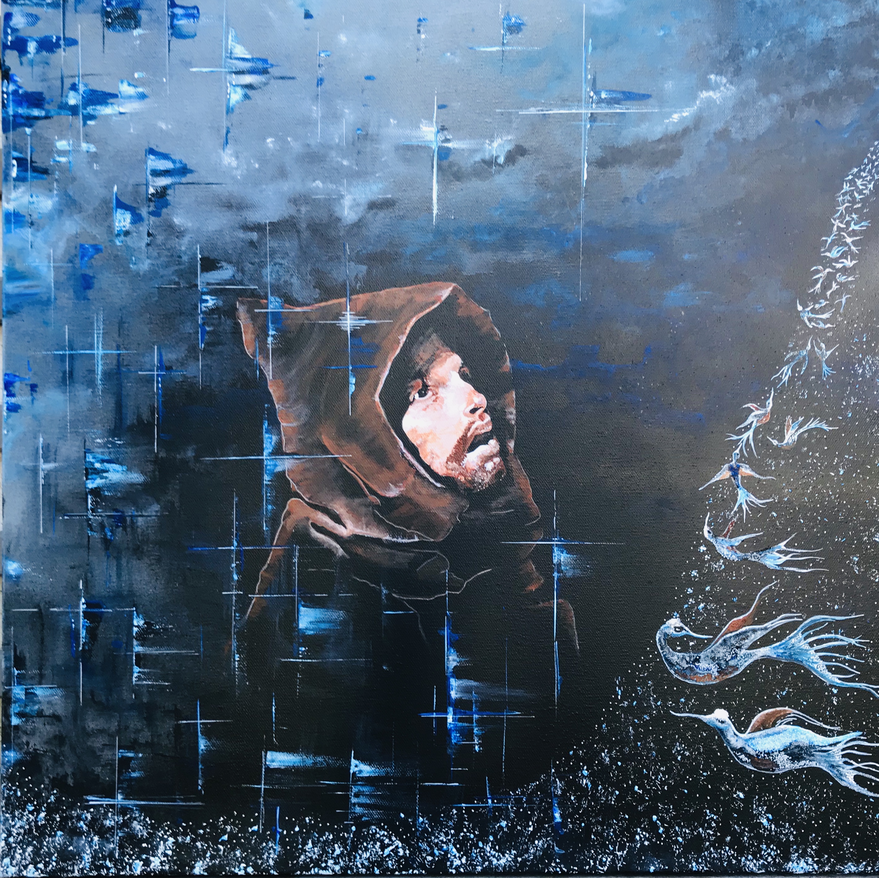Toile réalisée pour cette manifestation, évoquant Saint François et la prédiction aux oiseaux. Acrylique sur toile – 60 x 60